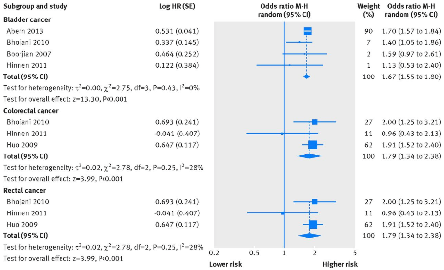 В результате проведенной работы исследователи выявили повышенный риск развития рака мочевого пузыря у пациентов с показателем риска (HR) 1,67; колоректального рака -1,79; рака прямой кишки – 1,79. При этом риск развития онкогематологических заболеваний и рака легкого после лучевой терапии рака предстательной железы выявлен не был. Абсолютные значения уровня риска варьируются в отдельных исследованиях для рака мочевого пузыря, толстого кишечника и прямой кишки от максимальных 3.8%, 4.2% и 1.2% до 0.1%, 0.3% и 0.3% соответственно. В завершение хочется сказать, что несмотря на повышенный риск развития вторичных опухолей мочевого пузуря, толстой и прямой кишки абсолютные значения остаются невысокими и дальнейшие исследования с более длительным периодом наблюдения требуются, что б подтвердить эти данные.