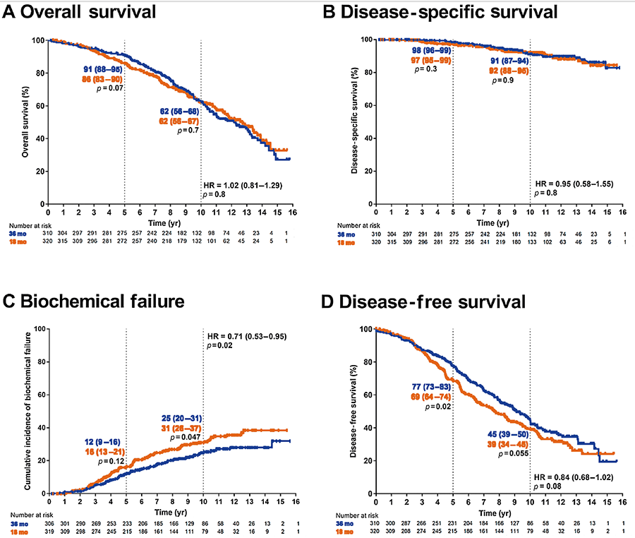 При медиане наблюдении в 9,4 года умерло 290 пациентов (147 в группе 1 против 143 в группе короткой АДТ). 5-летняя частота ОВ (95%) составляла 91% для длинной руки (88-95%) и 86% для короткой руки (83-90%), р = 0,07. Анализ QoL показал значительную разницу ( p <0,001) по шести шкалам и 13 пунктах в пользу 18-месячного AДT, причем два из них представляли клинически значимое различие в средних баллах ≥10 баллов.