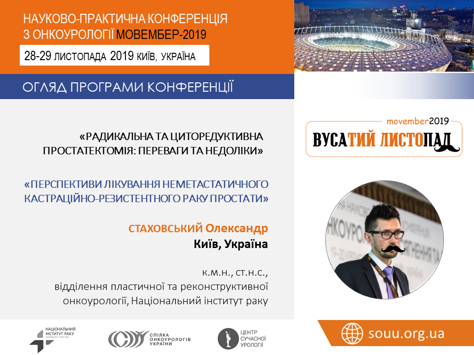 Онкоуролог Стаховський Олександр виступив з трьома доповідями: «Радикальна та циторедуктивна простатектомія: переваги та недоліки», «Перспективи лікування неметастатичного кастраційно-резистентного раку простати» та «Радикальна та паліативна цистектомія в контексті національних клінічних рекомендації діагностики та лікування раку сечового міхура».