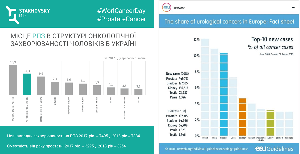 Європейська асоціація урологів EAU опублікувала інфографіку до Всесвітнього дня боротьби з раком #WorldCancerDay . Три урологічних рака входять в топ-10 найпоширеніших онкологічних захворювань у Європі: простата, сечовий міхур та нирки.