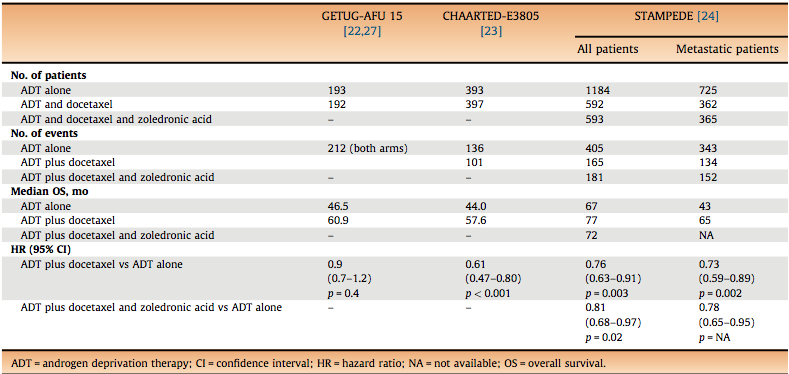 ОК Роздрукувати карту проїздаРабота итальянских исследователей, опубликованная в журнале «European Urology» за сентябрь, является систематическим обзором и мета-анализом использования противоопухолевого препарата Доцетаксела в комбинации с гормонональной терапией (ГТ) как первой линии лечения пациентов с метастатическими формами рака простаты. В обзор вошли 3 исследования с общим числом пациентов 2262. Большинство из них были в достаточно хорошем физическом состоянии. Одновременно Доцетаксел и ГТ получали 951 пациент. Остальные - 1311 человек - только стандартную ГТ. Именно они и составили группу контроля. Результатом анализа стал вывод про увеличение показателя общей выживаемости у пациентов, которые принимали комбинированную химио-гормональную терапию (р=0,002). Также у этих пациентов ученые выявили достоверное повышение показателя безрецидивной выживаемости (р<0,001). Исследование подтверждает гипотезу об ефективности комбинированного применения препаратов для пациентов с запущенными формами рака предстательной железы. Сейчас такую комбинацию препаратов стандартно используют в лечении метастатического рака простаты лишь при наступлении кастрат-резистентности (состояния, при котором опухоль теряет свою чуствительность к ГТ,- а это может произойти через год или даже через 2 после установления диагноза). В ближайшем времени рекомендации по добавлению Доцетаксела к первой линии терапии появятся в мировых и европейских стандартах лечения, но уже сегодня подобное лечение применяется в Национальном институте рака в отделении пластической и реконструктивной онкоурологии. В таблице ниже представлены обобщенные результаты трех рандомизированных исследований, которые вошли в мета-анализ и показатели общей выживаемости пациентов (OS).